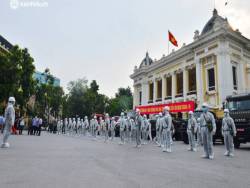 Theo ghi nhận của chúng tôi lúc 7h00 ngày 26/7, hàng chục xe chuyên dụng và các chiến sĩ của Lữ đoàn 86, Binh chủng Hóa học (Bộ Quốc Phòng) đã có mặt tại Nhà hát lớn Hà Nội để chuẩn bị cho chiến dịch phun khử khuẩn toàn quận Hoàn Kiếm