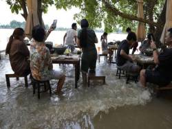 Anh Siripoj Wai-inta, 24 tuổi, ngồi ăn khi nước trào lên đến ống chân: “Đây là một bầu không khí tuyệt vời. Trong cơn khủng hoảng ngập lụt này, nó đã trở thành điểm thu hút đặc trưng của nhà hàng. Vì vậy, tôi muốn thử thách bản thân và thử trải nghiệm mới này”.