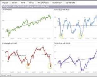 Mặc dù xu hướng của VNIndex trong dài hạn sẽ đi lên, nhưng tại các chu kỳ ngắn hạn 1 – 3 tháng thì thị trường lại giống như một quả lắc liên tục chuyển động từ tâm lý lạc quan, phấn khích sang hoang mang, bi quan rồi lại quay lại tâm lý lạc quan, phấn khích. Điều này được thể hiện rõ trong đồ thị %số mã có giá trên MA20 và MA60. Khi %số mã có giá trên MA20 giảm xuống quanh vùng 20% hoặc % số mã có giá trên MA60 giảm xuống vùng 30% thường là chỉ báo cho biết tâm lý thị trường đã đi vào giai đoạn bi quan, có xu hướng “quá bán” và đáy ngắn hạn của Index đang nằm ở đâu đó quanh đây.